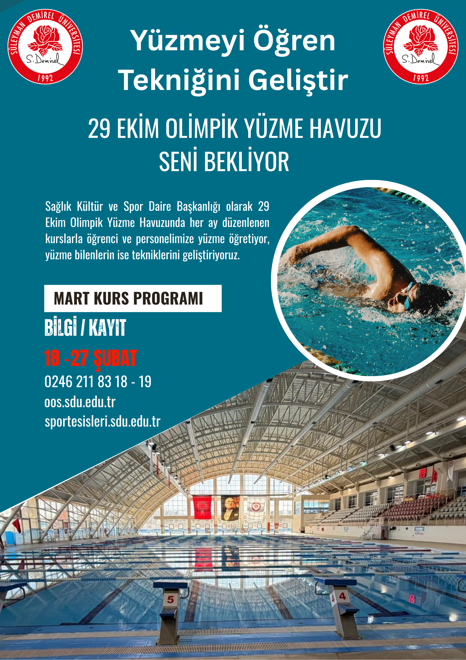 Üniversitemiz Sağlık Kültür ve Spor Daire Başkanlığınca 29 Ekim Olimpik Yüzme Havuzunda öğrenci, personel ve personel 1.derece yakınlarına (anne, baba, eş ve çocuk) yönelik yüzme kursları düzenlenecektir.